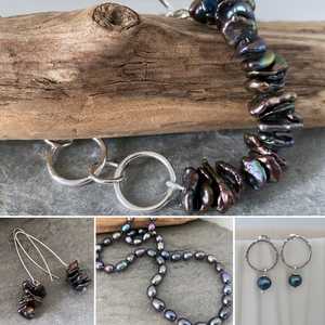 I find pearls fascinating and would love to learn more about them. Most of the pearls in todays jewellery (including mine) are freshwater cultured pearls, the more colourful of them are dyed during the cultivation process. It is the darker colours I’m more drawn to, the lustrous purples, blues, pinks and golds to me are reminiscent of the colours reflected on the sea by an amazing sunset.