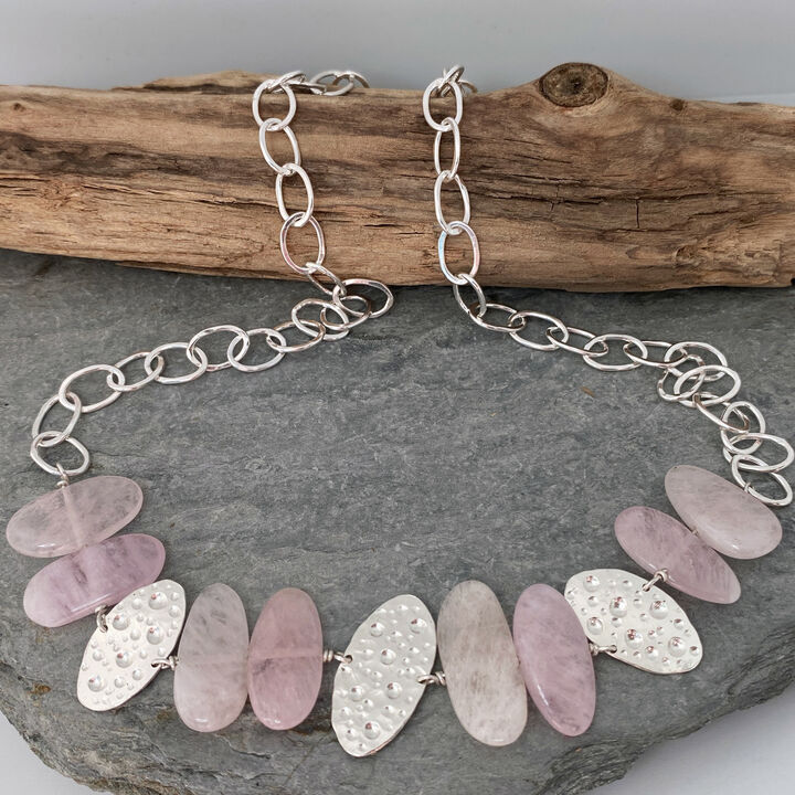 For this necklace I've echoed their organic oval shape with three hand cut sterling silver ovals patterned with a bubbles texture on one side and hammered on the reverse, then I've wire wrapped the beads and ovals in sections.