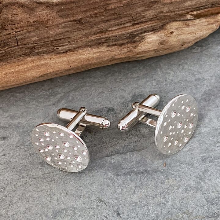Solid silver round cufflinks with a hammered texture and bubbles pattern.