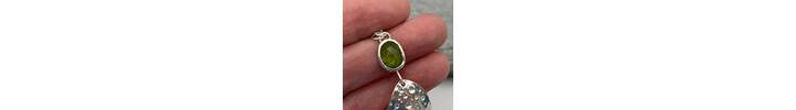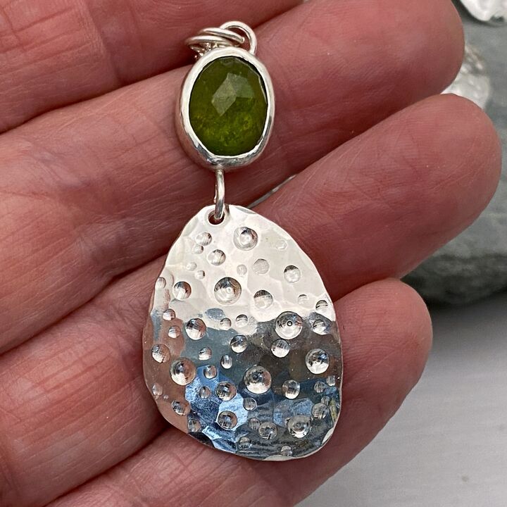 An eye catching and elegant hammered silver pendant with bubbles texture topped with a stunning green vesuvianite gemstone