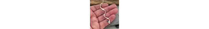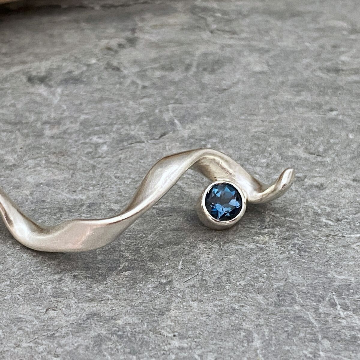 It is made from a length of smooth oval wire that has been twisted and manipulated until it forms a pleasing shape then a setting for the 4mm deep blue Topaz stone is added near the bottom. The metal has been filed and smoothed and given a shimmering brushed satin finish.